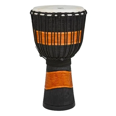 Hand selected goatskin heads Kiln dried shell with 20 coats of teak oil to protect and preserve the wood Hand carved from one piece of environmentally-friendly plantation grown Mahogany Finish: Black Stain Size: Medium 10" Height: 20" (51 cm)