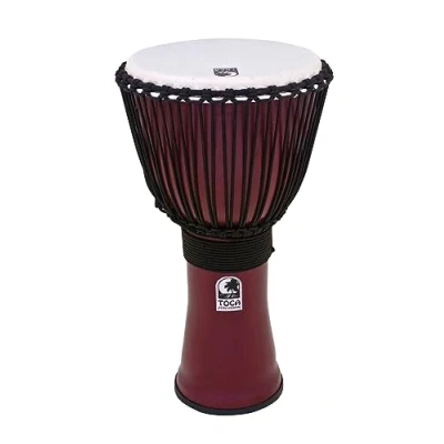 Toca Djembe Freestyle II Rope Tuned All weather synthetic head eliminates stretching, drying or losing pitch Higher, crisp slaps and deeper bass tones, Lightweight and extremely durable Protective non-slip rubber bottom Size: 12" Dark Red