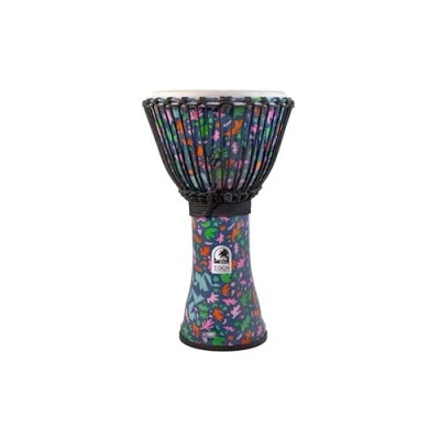 Compact size with full sound – 10" playing surface and 20" height offer the perfect balance between portability and powerful sound – ideal for on the go or smaller setups. Lightweight, robust plastic body – The lightweight design makes the djembe easy to transport without compromising on sound or stability. Natural feel – Covered with hand-selected goatskin for warm tones, authentic response and a comfortable playing experience. Classic rope tensioning – Traditional tuning system with durable tension rope allows for precise tuning and stable performance – no tools required. Versatile & non-slip – Non-slip, rubberised underside protects the floor and ensures a secure footing – perfect for drum circles, music therapy and recreational performances; available in various designs.