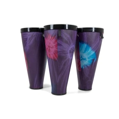 Robust PVC body, lightweight, weather-resistant and easy to clean Pre-tuned, synthetic furs, clear response and high base tone, skins can be easily removed and played in the hand Includes shoulder strap, kettle stackable inside each other for easy transport and storage, available in two sizes and two finishes Also available individually, set of 3 in size 12" x 23"
