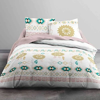 A soft and cosy duvet cover set for a good night's sleep Dimensions: 1 duvet cover 240 x 260 cm and 2 pillowcases 63 x 63 cm, suitable for a double bed. Balam design with shades of yellow, white, blue, pink and brown / The duvet cover is reversible 100% cotton (57 threads), easy-care Care instructions: wash at 40 °C; tumble dry at 60 °C; iron at 110 °C; do not bleach; do not dry clean; wash the item only for the first time
