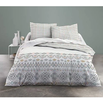 Size: 1 duvet cover 220 x 240 cm and 2 pillowcases 63 x 63 cm Material: 100% cotton, 57 threads, natural fibres Reversible design Small features: the concealed button closure for a neat finish; the hand pockets for easy insertion of the duvet; the pillowcase with a ruffled finish, very elegant Maintenance : washable at 40 °C, easy-care