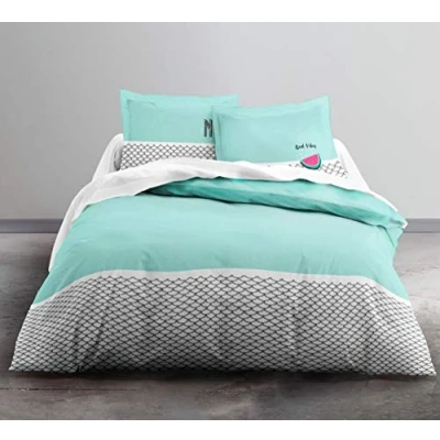 A soft and comfortable bedding for a good night's sleep Size: 1 duvet cover 240 x 260 cm + 2 pillowcases 63 x 63 cm, suitable for double bed. Watermelon model with light blue, white and black shades. Duvet cover is reversible 100% cotton (57 threads/cm²), easy to clean Care instructions: machine wash at 40 °C, tumble dry at low temperature (max. 60)/Iron at low temperature (110 degrees)/Bleaching and dry cleaning prohibited, please wash the item the first time..The small plus: the slits for the hands make it easy to attach the duvet and the concealed button placket ensures a neat look.