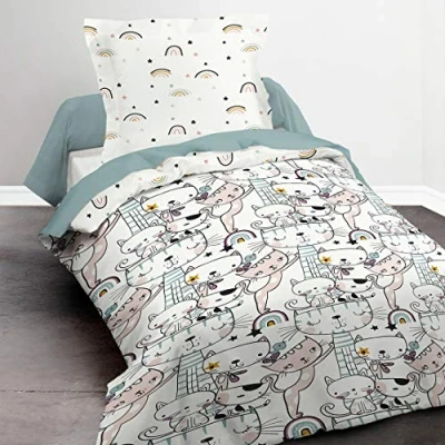 Amazon Bed linen set includes: 1 duvet cover 140 x 200 cm + 1 pillowcase 63 x 63 cm. Material: 100% cotton, 57 thread count, natural fibre. Easy to clean and machine washable at 40°C. Hand slot and button closure Oeko-Tex certified.