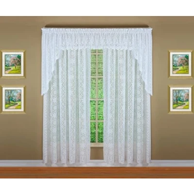 Premium jacquard lace, heavy weight, made of lofted yarn heavy weight knitted, providing privacy and sunlight filter entire whole piece engineered with scalloped bottoms and sides Soft hand and naturally self-drape 1.5” rod pocket, 100% polyester, easy care