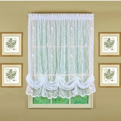 Jacquard lace sheer, semi-sheer, good balance for sheer and privacy, soft and airy, light filtering engineered scallop bottom Adjustable length with tie-up clips included. Easy setting up for a real balloon shade.
