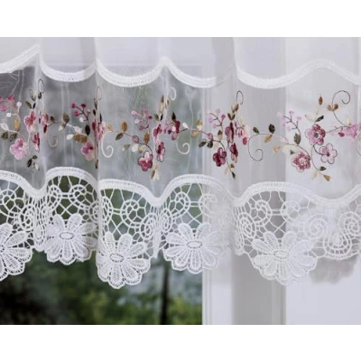 Macramé trim patchwork with fine embroidered organza appliqué on voile sheer body, 100% polyester. Crispy and soft, a true luxury voile sheer, offering airy and sheery light filtering, multi-color décor options for your home interior mix and match. Use this Valance 14" as window top treatment, or use this this Valance 14" as an insert filler with Swag 38". Add more untis of Valance 14" for wide windows and better fullness. Easy care, machine washable, 100% polyestyer. Each component and unit sold separately. Create your window décor styles by selecting different units and components.