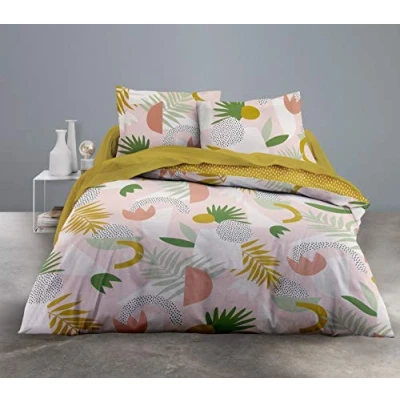 Size: 1 duvet cover 220 x 240 cm + 2 pillowcases 63 x 63 cm. Material: 100% cotton, 57 threads, natural fibres Reversible design The small plus: the concealed button closure for a neat finish; the hand slots to make it easier to put the duvet in place; the pillowcase with a ruffled finish, very elegant. Care : washable at 40 °C; easy-care