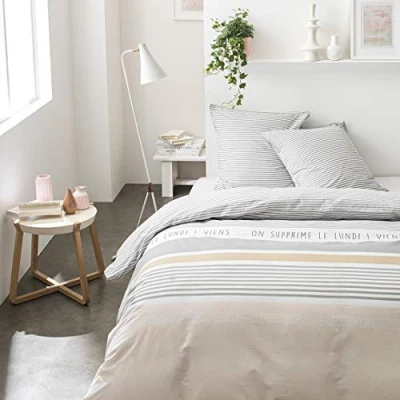 Bedding set includes: 1 duvet cover (220 x 240 cm) and 2 pillowcases (65 x 65 cm). Material: 100% cotton, 57 threads, natural fibre Easy care machine washable at 40 °C. Hand slot and button closure. Tested for harmful substances according to Oeko-Tex standard