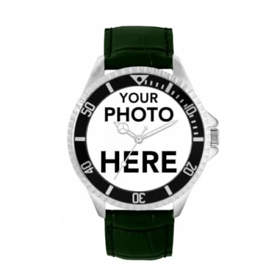 Toff London Personalised Engravable Photo Gifts for Men and Boys, Analogue Quartz Movement Watch with Black Bezel Green Leather Strap, Custom Made