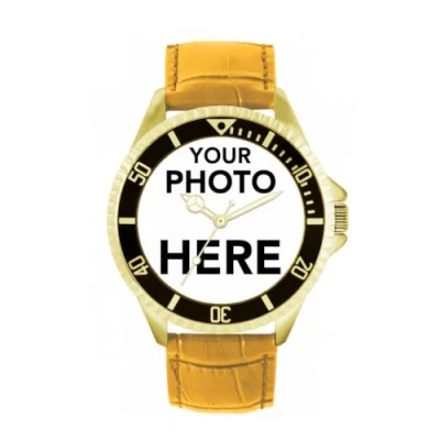 Toff London Personalised Engravable Photo Gifts for Men and Boys, Analogue Quartz Movement Watch with Black Bezel Yellow Leather Strap, Custom Made