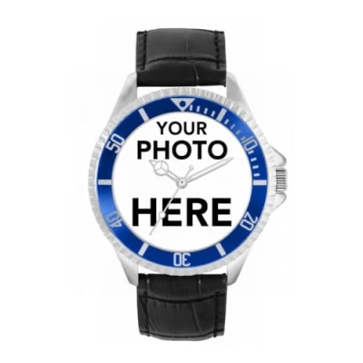 Toff London Personalised Engravable Photo Gifts for Men and Boys, Analogue Quartz Movement Watch with Blue Bezel Black Leather Strap, Custom Made