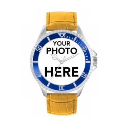 Toff London Personalised Engravable Photo Gifts for Men and Boys, Analogue Quartz Movement Watch with Blue Bezel Yellow Leather Strap, Custom Made