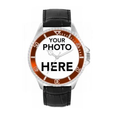 Toff London Personalised Engravable Photo Gifts for Men and Boys, Analogue Quartz Movement Watch with Brown Bezel Black Leather Strap, Custom Made