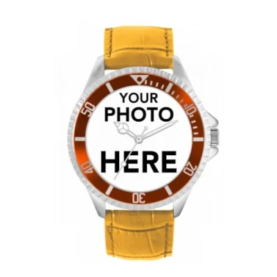 Toff London Personalised Engravable Photo Gifts for Men and Boys, Analogue Quartz Movement Watch with Brown Bezel Yellow Leather Strap, Custom Made
