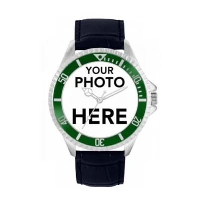 Toff London Personalised Engravable Photo Gifts for Men and Boys, Analogue Quartz Movement Watch with Green Bezel Blue Leather Strap, Custom Made