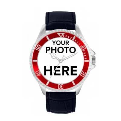 Toff London Personalised Engravable Photo Gifts for Men and Boys, Analogue Quartz Movement Watch with Red Bezel Blue Leather Strap, Custom Made