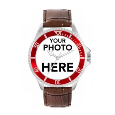 Toff London Personalised Engravable Photo Gifts for Men and Boys, Analogue Quartz Movement Watch with Red Bezel Brown Leather Strap, Custom Made