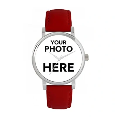 Your watch, your way: upload your own photo to create your personalised photo watch.,Easy to order: select customise now, upload your photo, adjust to fit and add to basket.,Free engraving: honour a special date for your loved one. You can get your watch case back engraved ,Features: 38mm silver case with a red leather strap that’s interchangeable. Powered by Miyota quar,Friendship photo gift: the perfect birthday, Christmas or anniversary gift for friends.