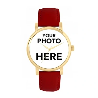 Your watch, your way: upload your own photo to create your personalised photo watch.,Easy to order: select customise now, upload your photo, adjust to fit and add to basket.,Free engraving: honour a special date for your loved one. You can get your watch case back engraved ,Features: 38mm gold case with a red leather strap that’s interchangeable. Powered by Miyota quartz,Friendship photo gift: the perfect birthday, Christmas or anniversary gift for friends.