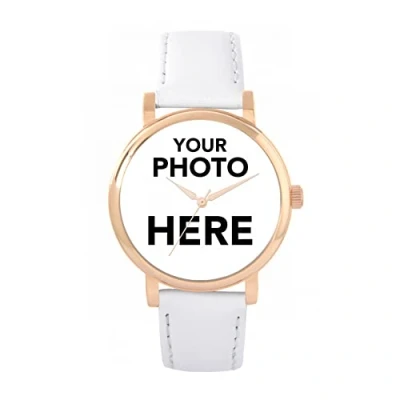 Your watch, your way: upload your own photo to create your personalised photo watch.,Easy to order: select customise now, upload your photo, adjust to fit and add to basket.,Free engraving: honour a special date for your loved one. You can get your watch case back engraved ,Features: 38mm rose gold case with a white leather strap that’s interchangeable. Powered by Miyota,Friendship photo gift: the perfect birthday, Christmas or anniversary gift for friends.