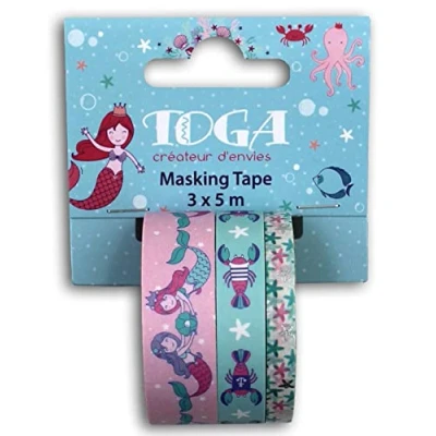 Assortment of 3 rolls of masking tape. Design: under the sea collection; colours: irised, green, blue, pink, lilac, white/mermaids, crabs and starfish. Roll dimensions: 1.5 cm x 5 m/ 1 cm x 5 m/ 0, 6 cm x 5 m The masking tape is a decorative adhesive tape made of mulberry fibre, it allows you to decorate notebooks, diaries, creative projects, furniture, walls... It sticks and removes without damaging your project and you can even write on it.