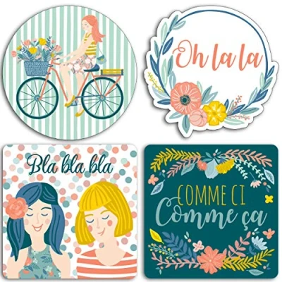 4 x Novelty Stickers Design: "Oh la la" collection/ pastel and bright colours/ "Oh la la" collection/ pastel and bright colours/ girly theme with girls on bikes, flower basket bouquets, polka dot and sailor motifs in a citadine spring atmosphere. Sticker dimensions: 10 x 10 cm Acid free Ideal for notebook covers
