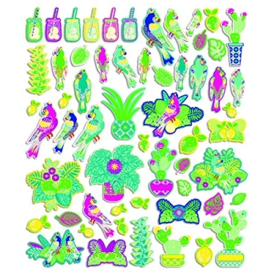 Assortment of printed and cut paper shapes Design: "hacienda à cuzco" collection; colours: fuchsia, green shade, yellow, turquoise blue/ theme of Latin American finances, sun, heat, good mood, party, vegetables, cactus, lemons, parrots and tile motifs of Portuguese architecture. Width: between 1.5 and 8.5 cm. Height: between 2, 5 and 9 cm. Paper weight: 180 g/m2.