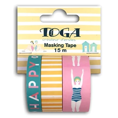 Assortment of 3 rolls of masking tape. Design: Collection "Bathing Beauties/Soft colours: yellow, blue, pink & green/Summer theme and feminine with retro baigneuses, scratches and positive words Roller Dimensions: 1 cm x 5 m/1, 5 cm x 5 m/2 cm x 5 m The masking tape is a decorative paper tape adhesive made from Mulberry, it allows you to decorate notebooks, diaries, planners, contacts, craft projects, furniture, walls, etc. Can be stuck and does not come off without damaging your project and you can even write on