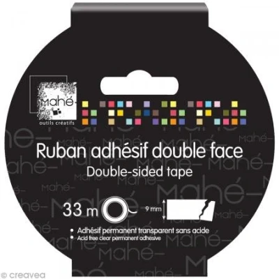 33 metres of double-sided adhesive tape, permanent and tearable Tape width: 9 mm Very easy to use: it tears very easily to the desired length, without using scissors. The protective tape is wider than the tape making it easier to apply