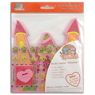 Set of 6 Princess Birthday Invitations Contains: 6 double princess castle cards 74 3D Epoxy Stickers 6 ribbons for writing the name of the guests. 66cm ribbon