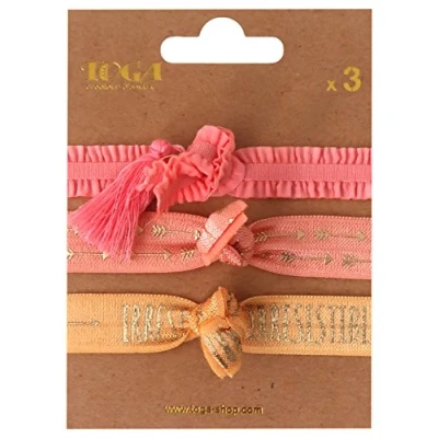 Set of 3 elastic. An elasticated strap Dimensions: 1.5 cm x 20 cm. The motives of the elastic bands: 1/Plain Pink saumoné with a gold charm and a pink tassle 2/Peach Background and arrows at the foil gold 3/SALMON background with writing "irresistible and arrows at the foil gold A customise as you like: hair accessories, bracelets, to close a notebook...