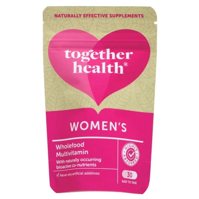 TOGETHER HEALTH Women's Wholefood Multivitamin provides daily comprehensive support with 22 essential nutrients from whole food sources. Designed for women’s health, this gentle, highly absorbable supplement supports energy, immunity, and hormone balance using natural ingredients and a low-heat production method for maximum efficacy.