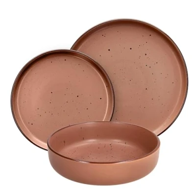 STURDY & HIGH QUALITY MATERIAL - Made of durable stoneware, these plates ensure durability and strength, perfect for everyday use without sacrificing style. EASY CARE - We recommend drying the dishes immediately after washing or storing them vertically, spaced apart Practical and functional: Microwave and dishwasher safe, offering maximum convenience in everyday life without compromising beauty and quality. Rustic elegance: Stoneware plate with refined design with dotted effect, ideal for a modern and natural touch to your table. Perfect for any occasion, from daily dinner to special events. Complete service: The set includes 18 plates divided into 6 dinner plates, 6 soup plates and 6 dessert plates, perfect for setting the table with elegance and practicality.