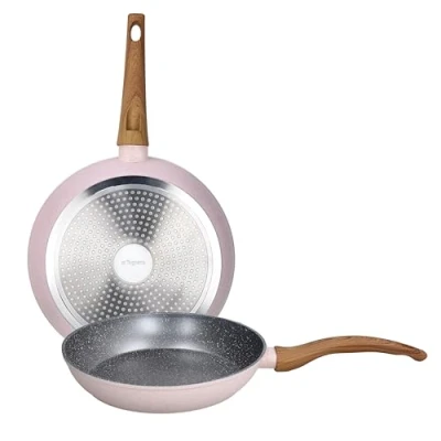 MULTI-LAYER NON-STICK COATING: The reinforced 4-layer inner coating ensures excellent non-stick properties, preventing food from sticking. PFOA and nickel free, these pans are ideal for healthy and natural cooking, allowing you to reduce the use of oils and fats. COMPATIBLE WITH ALL COOKERS: Suitable for any type of kitchen, these pans are compatible with gas, electric, glass-ceramic, halogen and induction hobs, offering maximum versatility for every cooking need. The thick induction base ensures perfect stability on the hob. VERSATILE AND EASY TO CLEAN SET: The set includes two different sized pans (24 cm and 28 cm) to suit every type of preparation, from crispy vegetables to juicy meat. Thanks to the high-quality non-stick coating, cleaning is quick and easy, even in the dishwasher. SOFT TOUCH HANDLES AND ELEGANT DESIGN: Refined design meets functionality with ergonomic soft touch handles designed to offer a secure and comfortable grip. The contrast between the delicate pink of the pan and the natural handle makes these pans a real eye-catcher in the kitchen. Homogeneous and fast cooking: Pepper Bamboo pans ensure even heat distribution, reducing cooking time and ensuring perfect results on any type of food. Moulded and forged aluminium allows you to cook efficiently without the risk of hot spots or burns.
