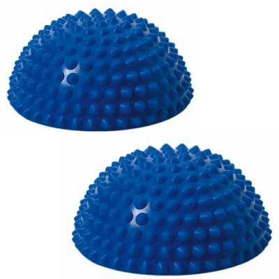 A set of 2 air-filled halfballs with conic spikes on its surface designed for balance trails to increase body awarness and coordination of children 200 kg maximum load training chart included Made in Germany