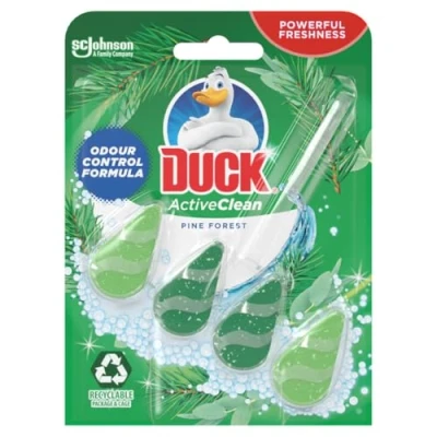 JoybuyDuck Active Clean Rim Block Pine 38.6g releases fragrant foam with every flush to keep your toilet clean, fresh, and stain-free for up to 3 weeks. Easy to use—just hang it under the rim—and it delivers 4x more foam than Duck 5-in-1 blocks.