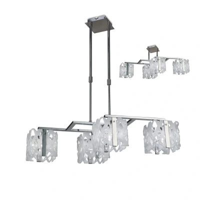 The Tokio Rectangular Telescopic Convertible 4 Light Pendant offers versatile lighting options in a sleek gloss white and polished chrome design. Its dimmable feature allows for customizable ambiance in your living space.