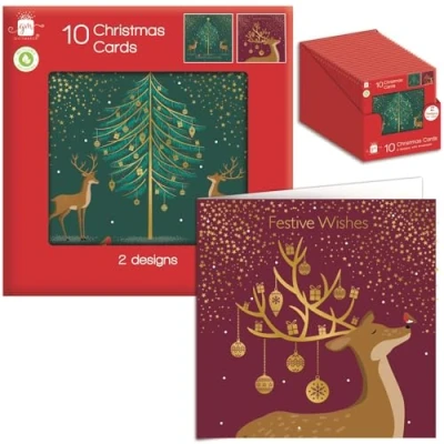 SPREAD THE HOLIDAY CHEER: Delight your friends, family, and colleagues with this charming Christmas card set. Ideal for sending warm wishes and spreading the magic of the season. PERFECT FOR THE FESTIVE SEASON: This beautifully designed Christmas card pack is full of festive joy and spirit, making it the ideal choice for your holiday greetings this year. CONTEMPORARY CHRISTMAS DESIGNS: The pack includes two enchanting card designs, featuring a stylish reindeer theme in red or green & gold. Each has a Christmas Greeting inside and a touch of Christmas sparkle. ENJOY A SUSTAINABLE CHRISTMAS: Feel good about spreading holiday cheer with these eco-friendly cards. Fully recyclable and plastic-free, they help you celebrate Christmas in a sustainable way. PERFECTLY SIZED: This multi-pack contains 10 cards, each sized at an easy to send letter size 140 x 140mm, making them easy to send and helping you manage the cost of your Christmas greetings.