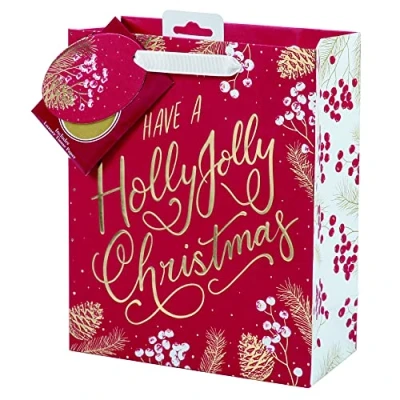 This Christmas gift bag packaging set has a festive "Have a Holly Jolly Christmas" printed design Each bag comes with matching gift tag and sheets of luxury tissue paper for packing Colour: Red with gold tissue paper The gift bag is sized medium sized, ideal for perfume & jewellery Approx Size: 260 x 210 x 100mm