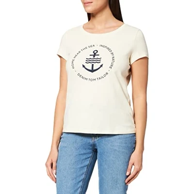 TOM TAILOR Denim Ladie's 1031478 T Shirt with Logo Print Made from Sustainable Cotton, 22515 Soft Creme Beige, M