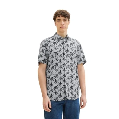 TOM TAILOR Denim Men's 1041392 Relaxed fit Short Sleeve Shirt with Palm Tree Pattern, 35586 Navy Summer Print, L