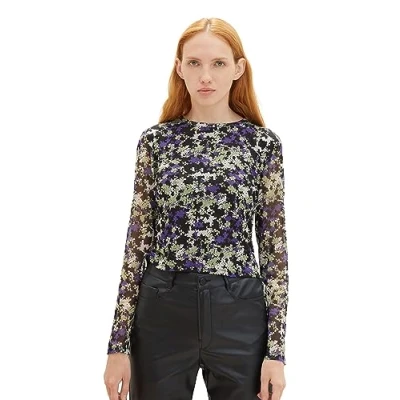 TOM TAILOR Denim Women's 1038382 Mesh Long Sleeve Shirt with Pattern, 32418 Lilac Green Flower Print, XS