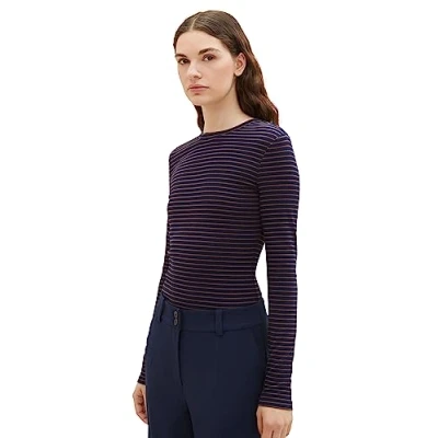 TOM TAILOR Denim Women's Long Sleeved Shirt with Stripes, 34269 Navy Brown Stripe, XS