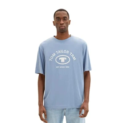 TOM TAILOR Men's 1035618 Relaxed fit t Shirt with Logo Print, 12364 Greyish Mid Blue, S