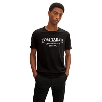 TOM TAILOR Men's Organic Cotton Logo Print T Shirt 1021229, 29999 Black, S