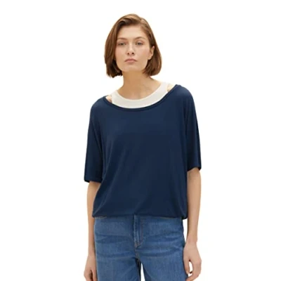TOM TAILOR Women's 1036775 2 in 1 T Shirt with Cord Detail, 11758 Midnight Sail, S