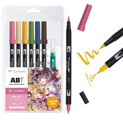 Tombow ABT Dual Brush Pen watercolour MANGA set Flower, of 6 + brushes, colouring templates & video tutorial [ABT 6P FLOWER]