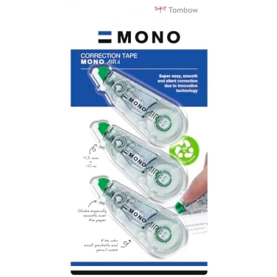 INNOVATIVE AIR TECHNOLOGY: The MONO air4 correction roller enables effortless and even rolling thanks to the lack of resistance. Unrolling to the last millimetre. CLEAN AND PRECISE CORRECTING: The flexible tip enables precise corrections without fraying or rippling. The tape adheres reliably and ensures an even typeface. HIGH COVERAGE: The extra opaque correction tape ensures clean corrections without show-through. No copy or fax shadows, so documents look professional and neat. ERGONOMIC & FLEXIBLE: The scooter is suitable for left- and right-handed users thanks to its central rolling mechanism. The flexible tip enables precise application, while the protective cap protects the tape. SUSTAINABLE DESIGN: The housing is made of 100 % recycled plastic and is particularly easy to handle. At 4.2 mm wide and 10 m long, the correction tape offers a long service life for many corrections.