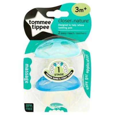 First-stage teether for tender gums and first teeth Textured surfaces massage tender gums Channels designed to hold teething gel for easy, targeted application 2 different teethers in each pack Suitable for babies aged 3 months +